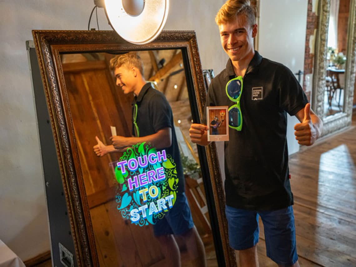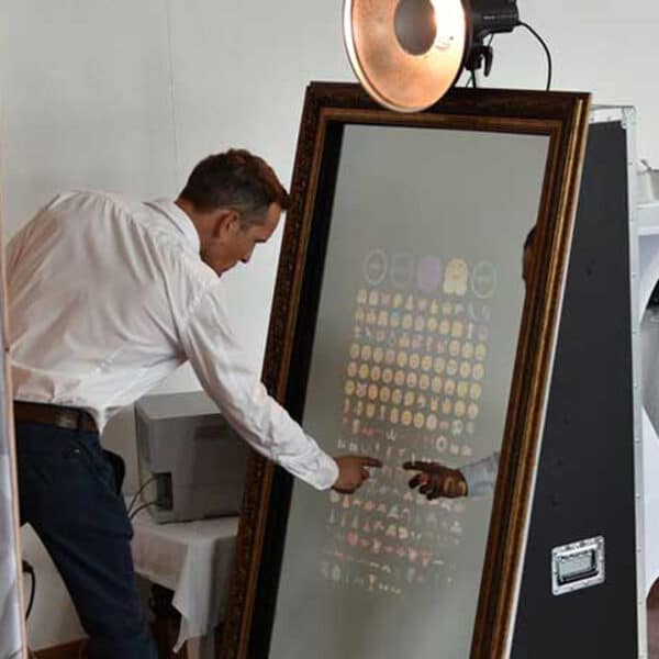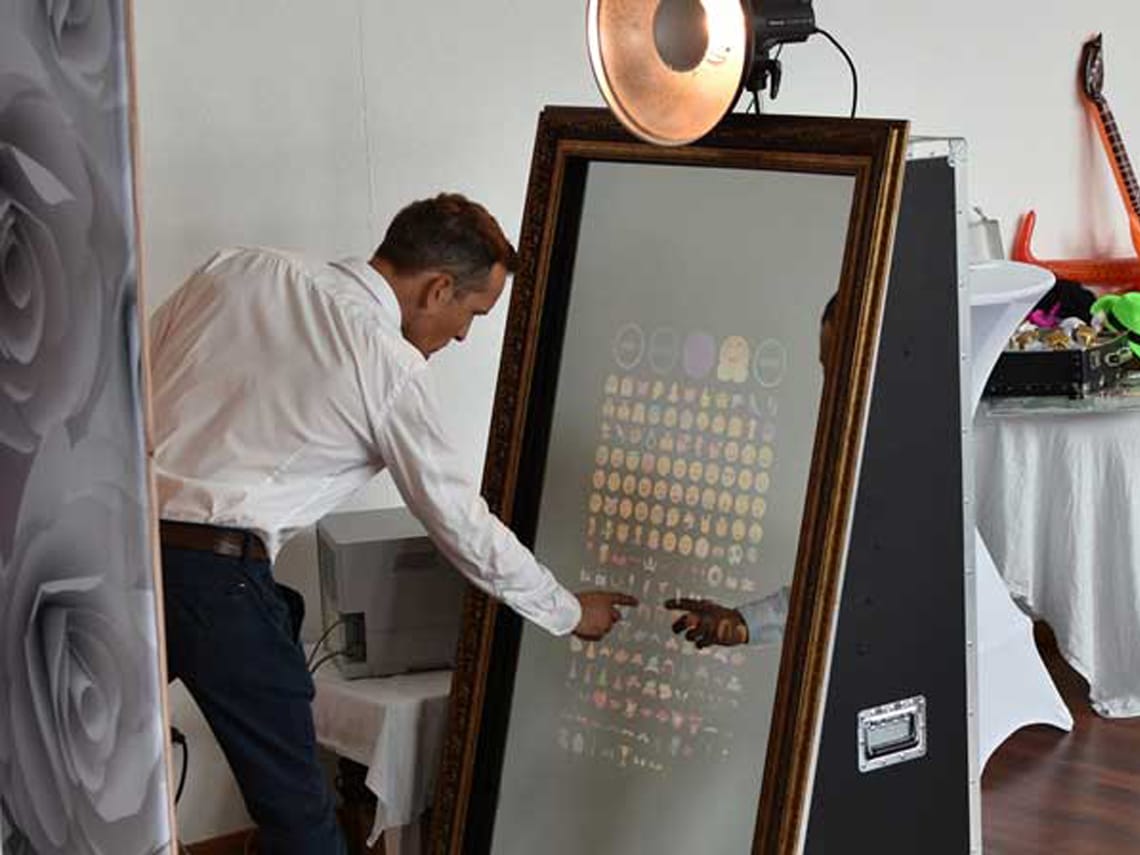 Die einzigartige Spiegelfotobox ist ein interaktiver Fotospiegel, der mit einer Touchoberfläche ausgestattet ist. Der Spiegel mit Touch sorgt dafür, dass die Teilnehmer mittels Animationen zum Mitmachen animiert und durch den Ablauf geführt werden – und das mit einem hohen Maß Bedienerfreundlichkeit.